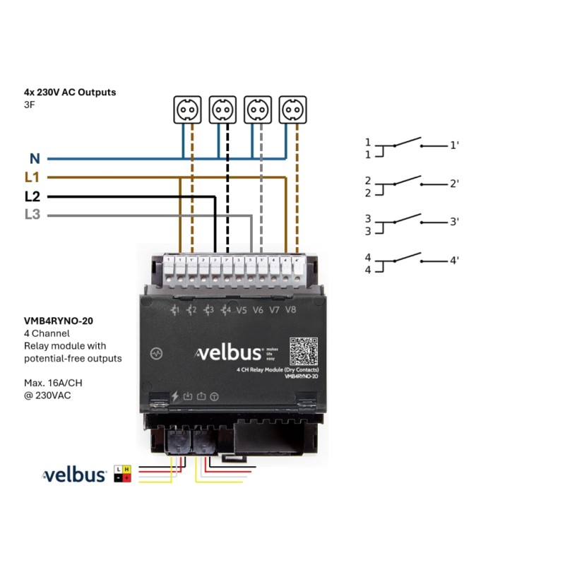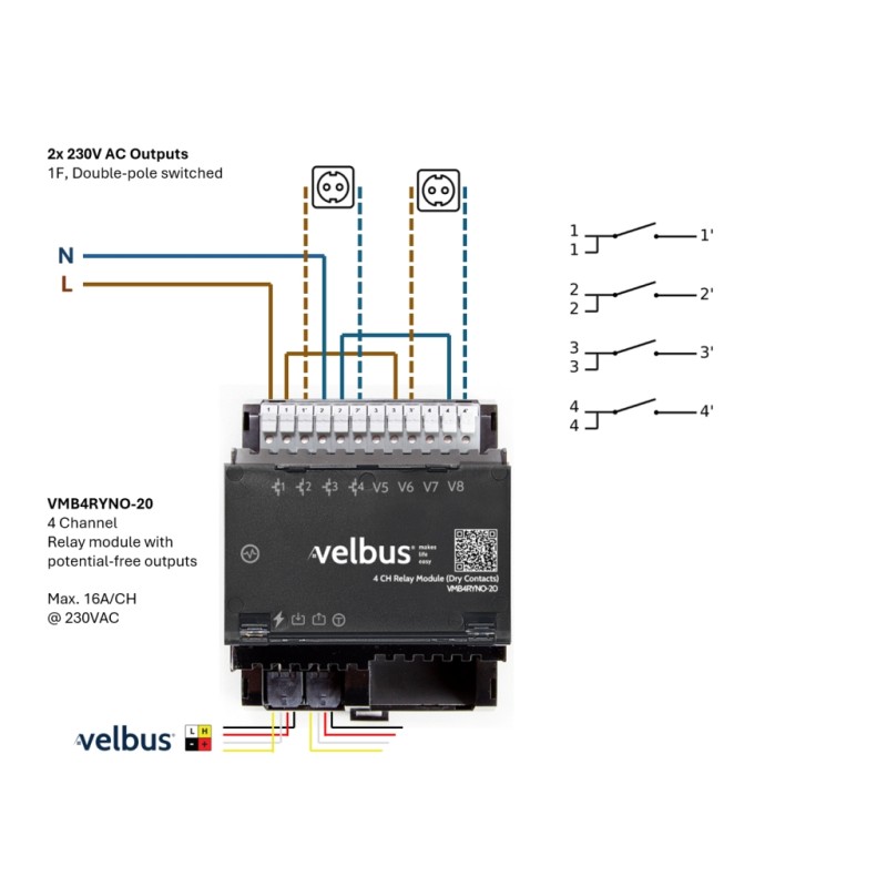 In addition, the VMB4RYNO-20 introduces four virtual channels that can be monitored via the module's LEDs and controlled directly using the physical buttons. Combined with logical functions (AND, OR, NOR, NAND, XOR, XNOR) in Velbuslink, this enables advanced automation scenarios tailored to your needs.