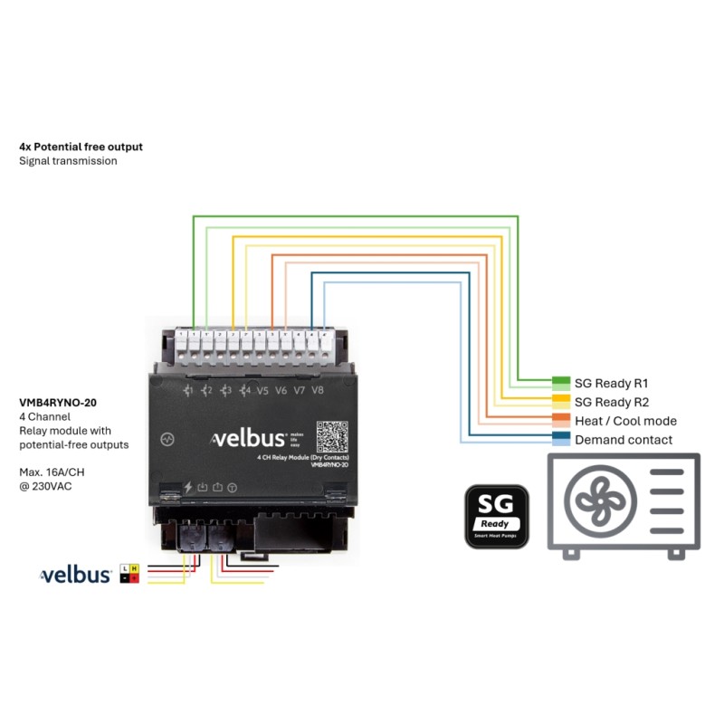 Whether it's illuminating your space with dynamic lighting, powering appliances, or seamlessly integrating with other smart devices like SG-ready heat pumps and alarm systems via potential-free contacts, the VMB4RYNO-20 provides the key to unlock the full potential of your automated home. It also effortlessly handles devices requiring a pulse contact, such as a garage door, for smooth and precise control.