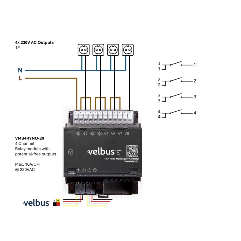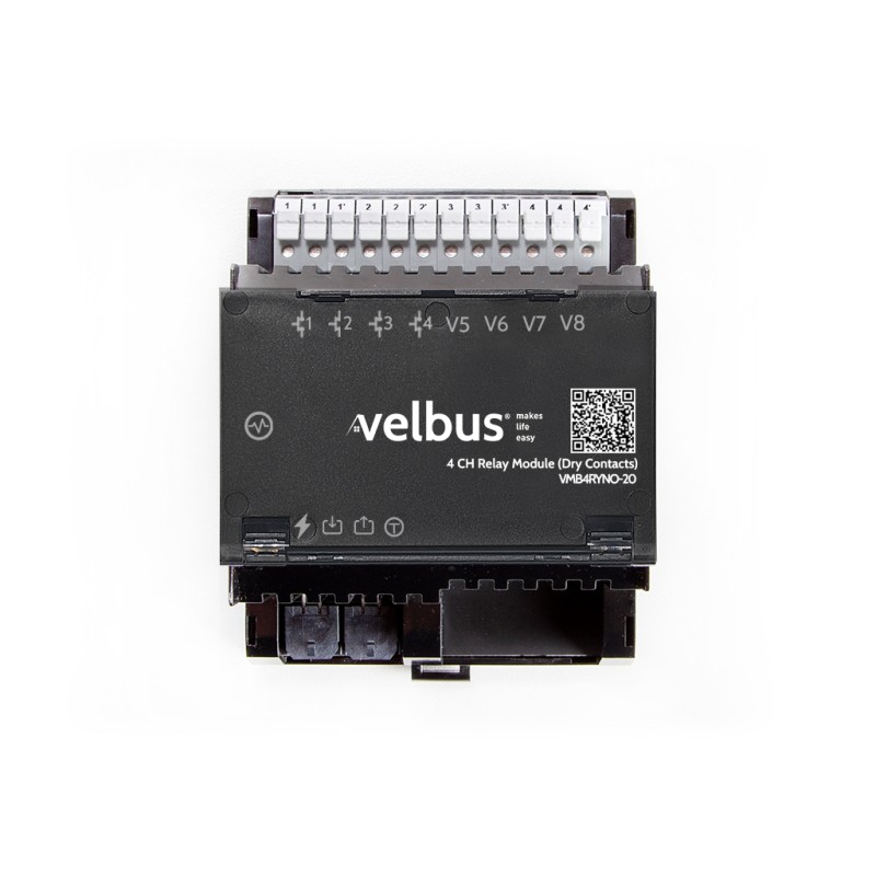 De Velbus VMB4RYNO-20 4-kanaals relaismodule - het hart van je slimme automatiseringssysteem voor het bedienen van toestellen. Met deze veelzijdige module beheer je moeiteloos je leefruimte door eenvoudig verschillende apparaten te bedienen.